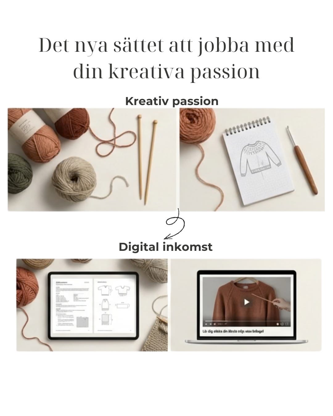 En digital produkt är egentligen ganska enkel. Det är förpackad kunskap, kreativitet eller en process som hjälper någon annan. Det kan vara: • Stickmönster som PDF • Digitala printables eller guider • Onlineworkshops • Videokurser • Notmaterial • Mallar Det viktiga är inte formatet. Det viktiga är att produkten bygger på något du redan kan. Alla som kan något som någon annan vill lära sig har möjlighet att skapa en digital produkt. De vanligaste hindrenNär man börjar tänka i de här banorna dyker ofta samma hinder upp. Tid. Pengar. Och att nå ut. Många känner att de inte har tid att utveckla något nytt. Att ekonomin redan är osäker. Och att det är svårt att hitta en publik. Sedan kommer tankarna. Det finns redan så många andra. Jag är inte expert nog. Ingen vill betala för min hobby. Jag har för liten publik. De tankarna känns ofta väldigt verkliga. Men de betyder inte att vägen är stängd. Det är inte du som är problemetMånga kreativa försöker få sin passion att fungera inom ett system som egentligen inte är byggt för kreativitet. Man försöker passa in i strukturer där det bara finns ett begränsat antal platser. Och när det inte fungerar är det lätt att tro att man själv har misslyckats. Men det som saknas är oftast inte disciplin. Det som saknas är en metod. Ett sätt att arbeta som gör det möjligt att bygga något hållbart kring sin passion. Inte mer press. Inte mer prestation. Utan bättre verktyg och mer stöd. Är du redo?För många börjar förändringen med en enkel fråga: Är du redo att testa ett nytt sätt? Redo att se din kunskap som något värdefullt. Redo att dela det du kan. Redo att bygga något steg för steg. Det handlar inte om att förändra sin passion. Det handlar om att förändra sättet man arbetar runt den. Det finns en Maja i många av oss. Och ibland börjar allt med att man vågar ta ett första steg. Om du också funderar på hur din kreativa passion kan få mer plats i livet Boka en gratis 30-minuters Klarhetssamtal |
